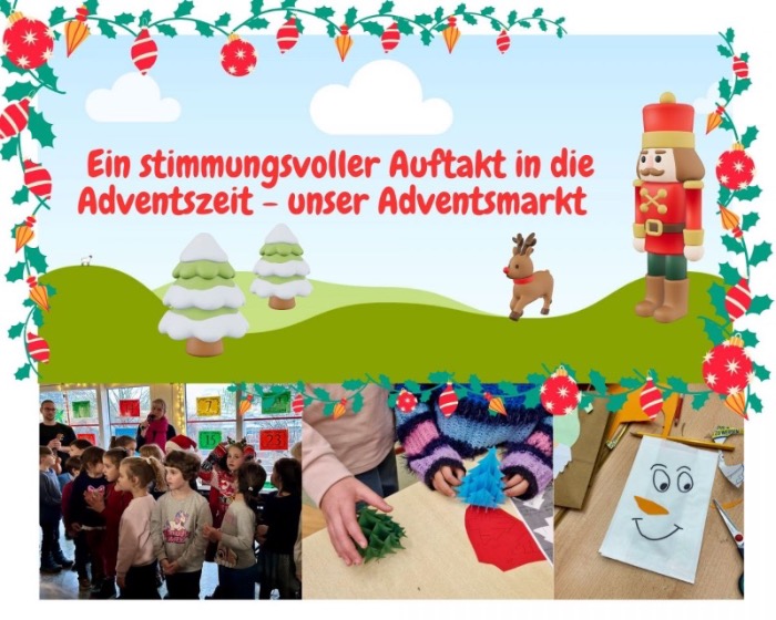 Am Freitag, den 5. Dezember, fand in der Zeit von 15:00 bis 18:00 Uhr unser diesjähriger Adventsmarkt statt. Eröffnet wurde der Nachmittag von der Ukulelen-AG unter der Leitung von Herrn Karamandis, unterstützt von den Kindern der 1. Klasse, die stimmungsvoll „Oh Tannenbaum“ sangen.